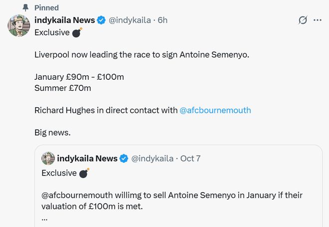 博主indykaila News此前就报道表示,如果收到符合心意的报价,伯恩茅斯有可能选择在冬窗出售塞梅尼奥。而今他对此进行跟进报道,表示利物浦正在这场争夺战中处于领先位置,如果在冬窗出手,预计转会费在9000万-1亿英镑之间,而若等到明年夏天,则有可能降到7000万英镑。