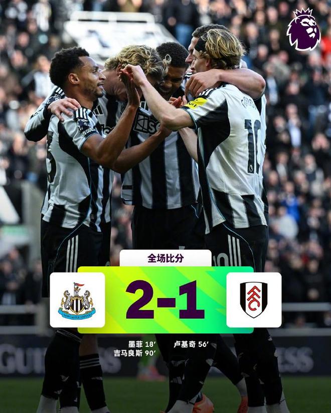 本场比赛,纽卡斯尔主场面对富勒姆,开场第18分钟依靠雅各布-墨菲的低射破门,取得1-0的领先优势。直到下半场第56分钟,卢基奇门前头球补射破门,帮助富勒姆1-1扳平比分。第90分钟,吉马良斯补射破门,帮助纽卡斯尔2-1完成绝杀。