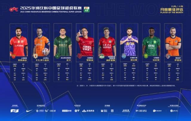 注:因第23、24、26轮部分比赛调赛至10月4日进行,故9/10月月度评选范围为联赛第23-28轮共计6轮比赛,参选球员数据以上述6轮比赛数据为准。